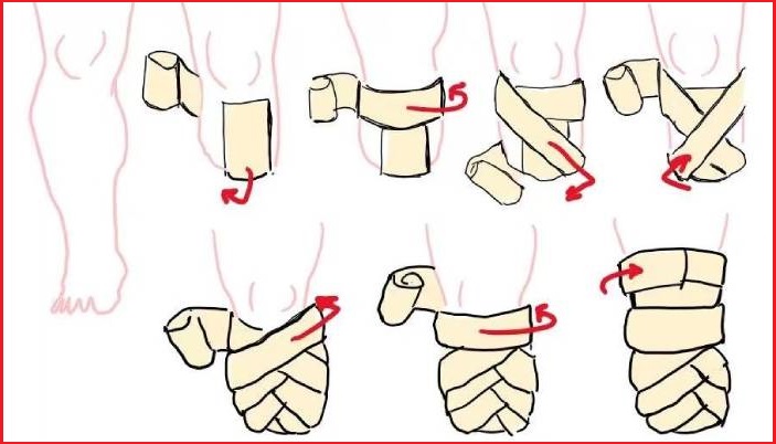 -برای اینکه تمام بخش های قطع عضو شده و کمر به خوبی با باند پوشیده شوند،باند را به صورت ضربدری ببندید.